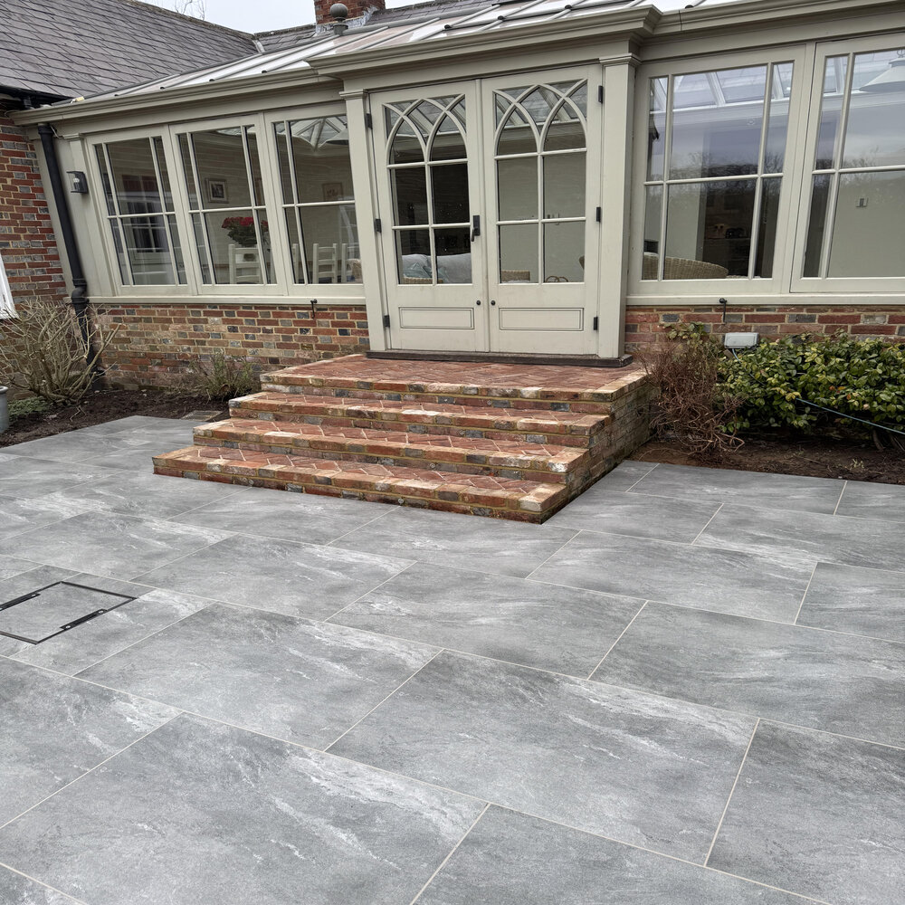 We redesigned this garden’s access with new steps built from reclaimed brick, laid in a herringbone pattern for added detail and charm. The patio area was completed in porcelain tiles, offering a crisp, low-maintenance finish that complements the traditional materials